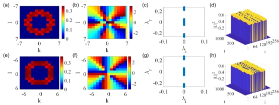 图1: 携带5个拓扑荷的两种类型的量子液滴。(a-d)第一种类型量子液滴的密度分布、相位、线性稳定性分析和动力学实时演化稳定性分析。(e-h)第二种类型量子液滴的密度分布、相位、线性稳定性分析和动力学实时演化稳定性分析。